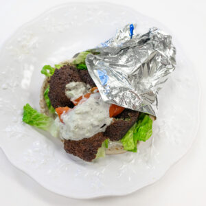 Homemade falafels, lettuce, tomatoes, and Tahini Sauce or hummus (pictured is taziki sauce- not vegan) on your choice of tortilla. You can make it any way you want it